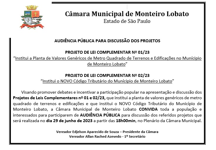 Audiência Pública - Planta de Valores Genéricos de Metro Quadrado de Terrenos e Edificações e Novo Código Tributário do Munícipio de Monteiro Lobato
